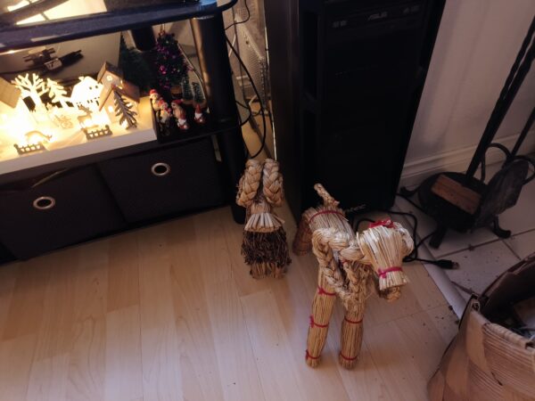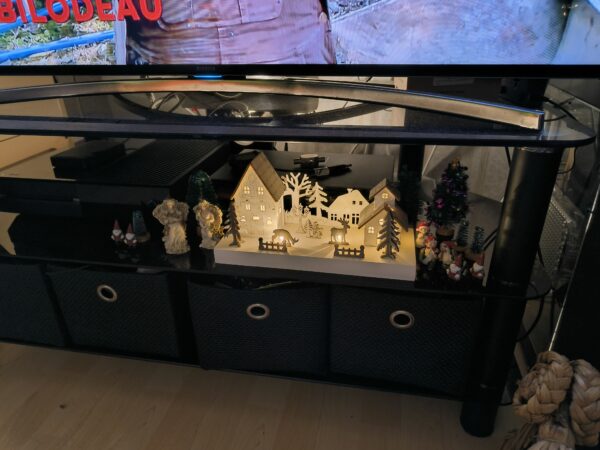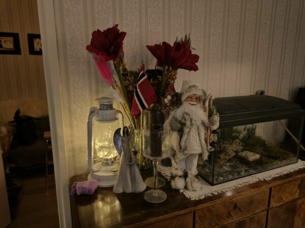 Siden vi har vært på ferie i utlandet har jeg ikke fått pyntet før 1 søndag i advent slik jeg pleier, så nå ble det sein pynting. Dermed tillot jeg meg en bitteliten tanke med julepynt i tillegg til lysene vi har oppe.